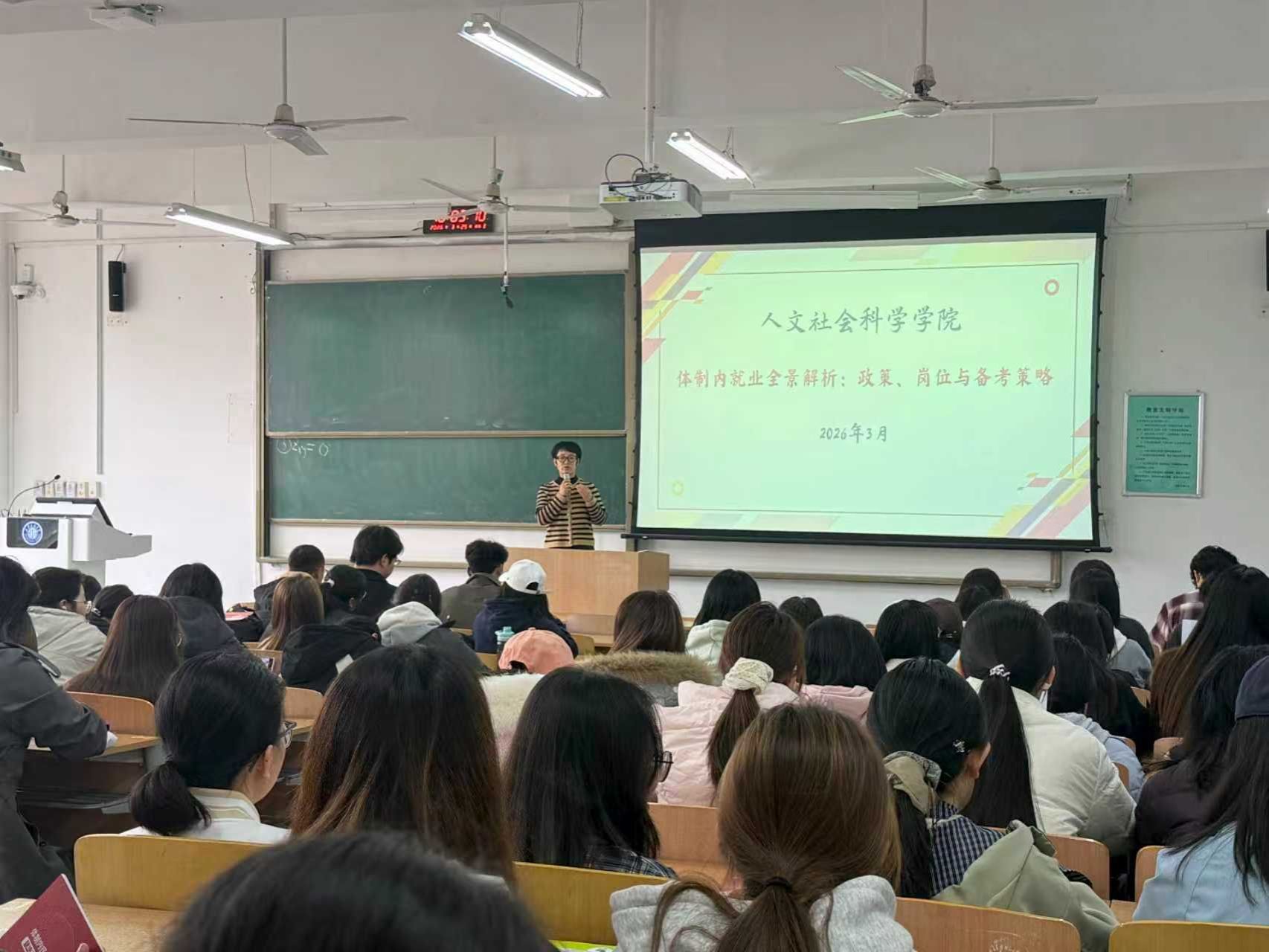 为扎实推进“一站式”学生教育服务体系建设,助力学生高质量就业,3月25日,人文社会科学学院在临潼校区举办“体制内就业全景解析”专题讲座。学工办主任杜静主持会议,校外导师李丹担任主讲,2023、2024、2025级本科生参加。讲座伊始,李丹结合近年高校毕业生规模持续扩大的背景,系统分析了当前就业市场现状。她重点围绕考公、事业编、央国企、银行四大主流方向,从招录规模、竞争比例、薪资结构、职业发展路径等维度进行对比...