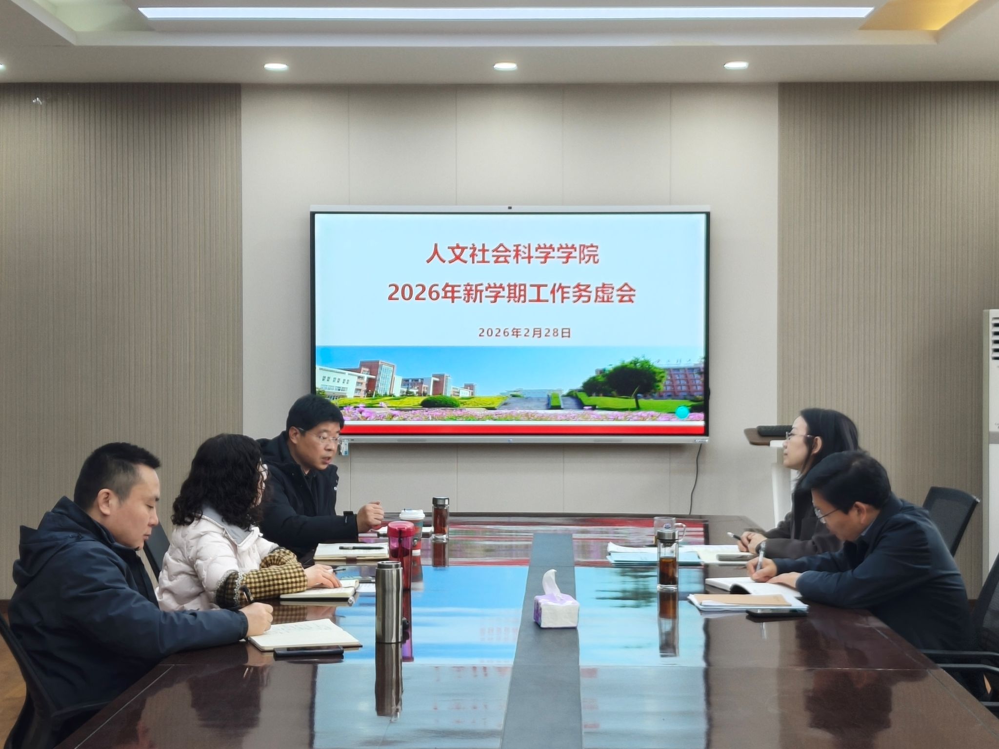 为深入分析当前工作形势,全面梳理2026年重点工作,明确发展思路,确保全年工作开好局、起好步,2月28日上午,人文社会科学学院在人文楼326会议室召开新学期工作务虚会,学院班子成员、办公室主任参加会议,会议由学院院长陈莉霞主持。会上,学院党委书记李喜峰传达了学校第九届教职工代表大会暨工会会员代表大会精神,重点解读了张晓晖校长的工作报告、学校“十五五”事业发展规划纲要(草案)和张志昌书记总结讲话精神。...