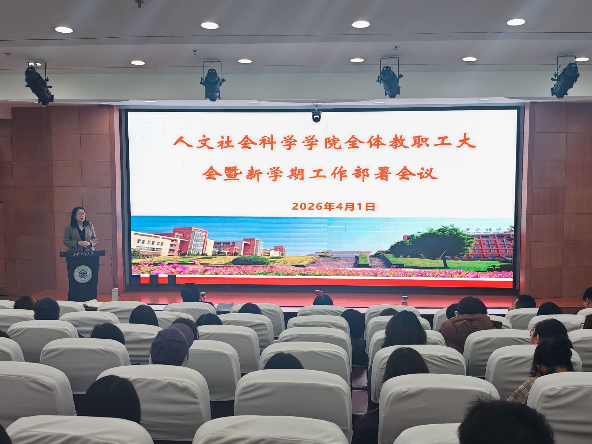 2026年4月1日下午,人文社会科学学院在临潼校区图书馆一楼报告厅召开新学期全体教职工大会暨2026年工作部署会议,学院班子成员及全体教职工参加会议,会议由学院院长陈莉霞主持。会上,学院党委书记李喜峰传达了学校2026年工作部署会精神,对学校2026年工作要点、主要工作目标任务安排等进行了解读,并就党建工作、稳定安全、意识形态和师德师风建设等重点工作做了安排部署。陈莉霞就2025年年终奖励绩效分配方案做了详细说明,...