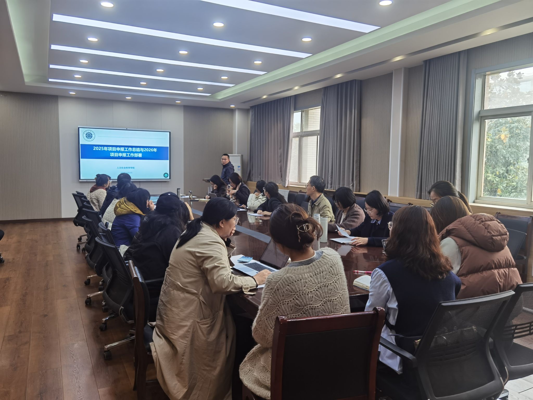 为系统总结学院2025年度项目申报工作,进一步提升学院教师的科研创新能力,全面部署并启动2026年度项目申报工作,10月22日,人文社会科学学院在临潼校区人文楼召开2025年项目申报工作总结暨2026年国社科和教育部项目申报动员部署会。人文学院院长陈莉霞、副院长田太荣及全体科研骨干参会,会议由田太荣主持。