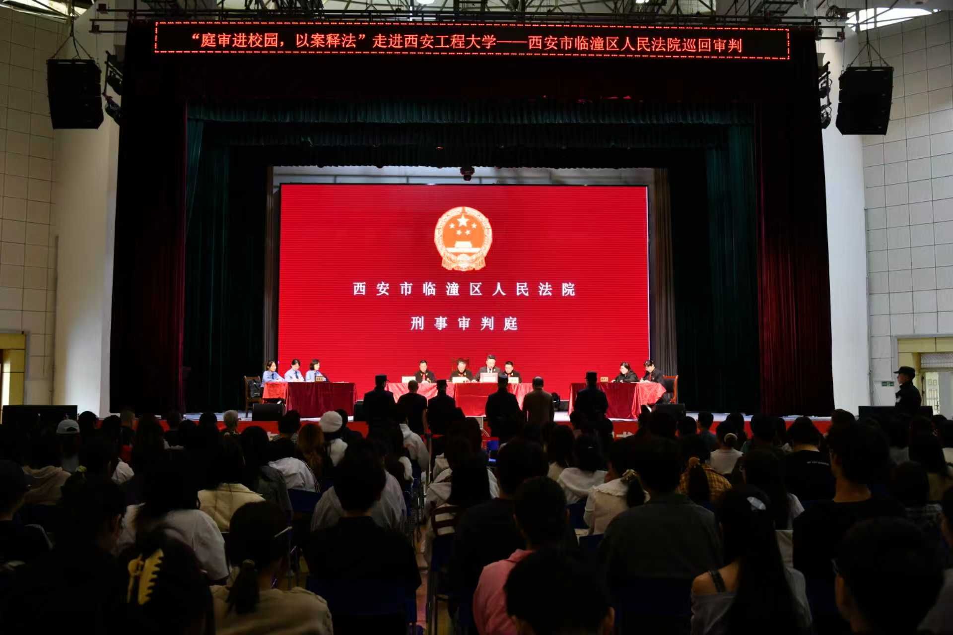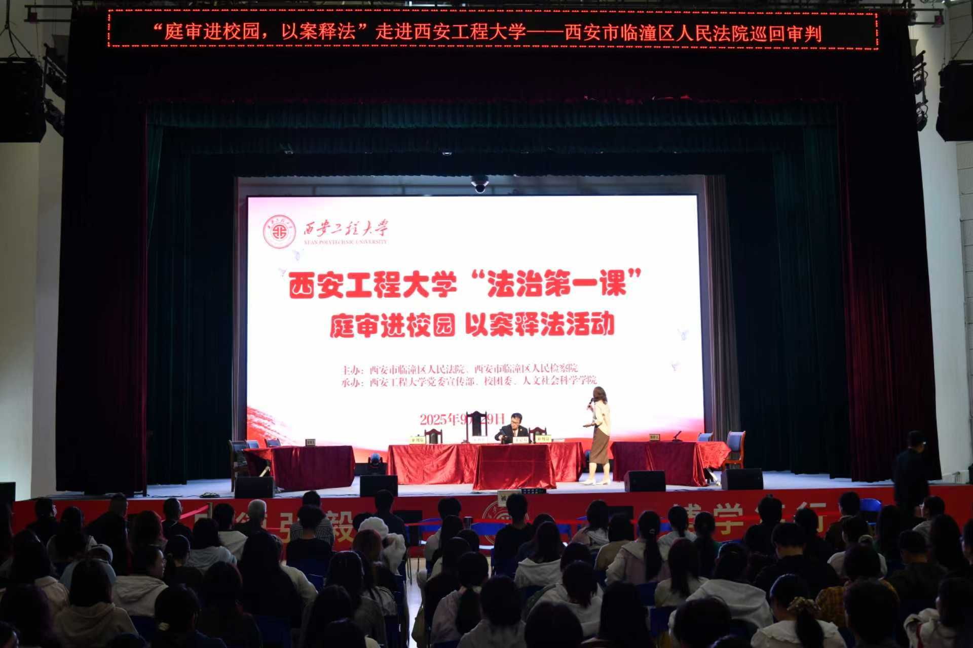 2025年9月29日上午,一场别开生面的“法治第一课”在西安工程大学临潼校区大学生活动中心庄严举行。西安市临潼区人民法院、临潼区人民检察院携手西安工程大学党委宣传部、校团委、人文社会科学学院,共同举办法治第一课暨“庭审进校园、以案释法”活动,将真实的刑事审判法庭搬进大学校园,现场审理了临潼区首例侵犯公民个人信息案件。临潼区法院院长卢光武担任审判长,检察院检察长张艳娟出庭支持公诉,为300多名师生带来了一堂生动而深刻的法治教育实践课。
