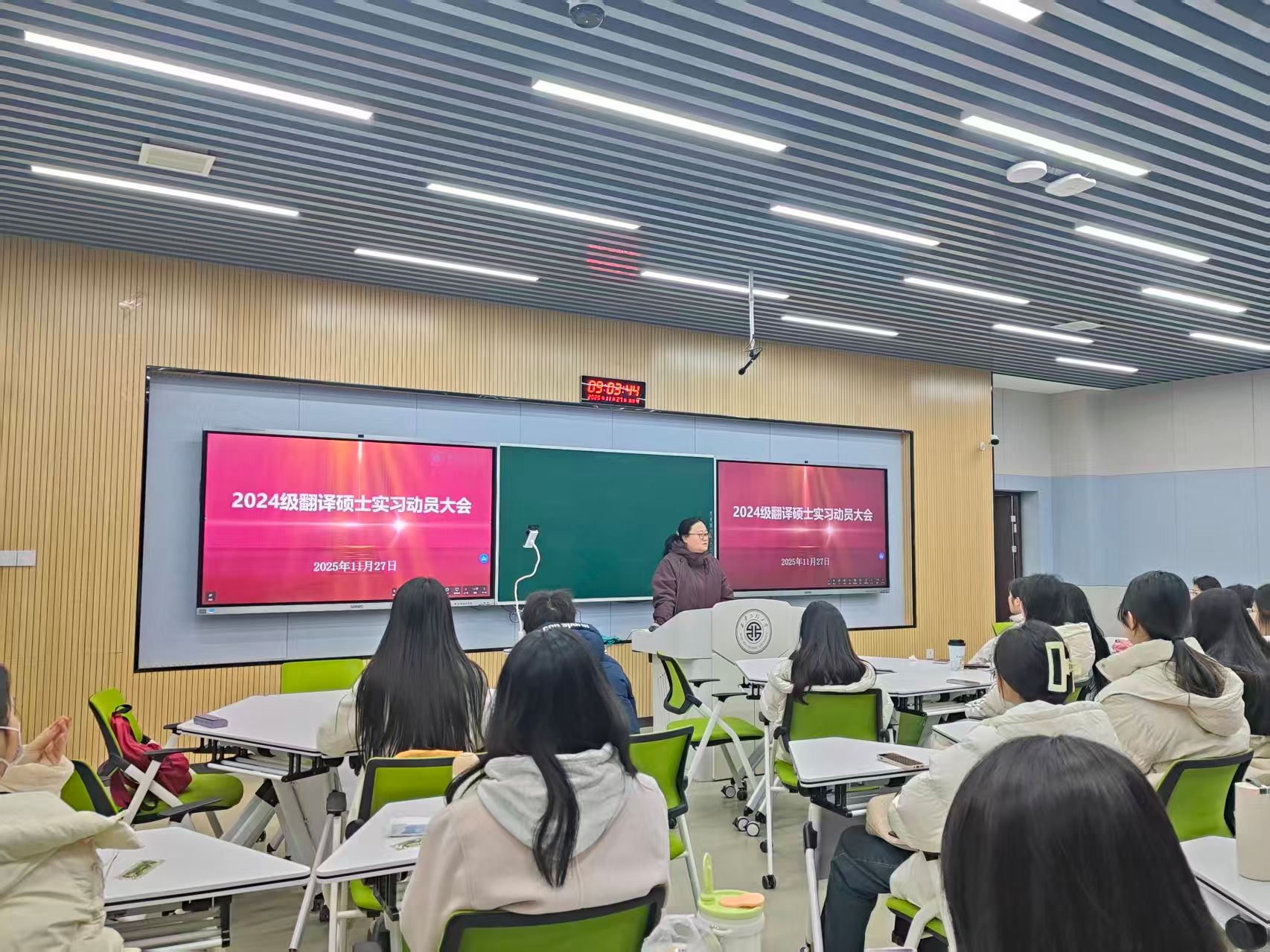 为深入推进研究生实习工作,加强校企合作,提升学生的实践能力和职业素养,2025年11月27日,西安工程大学人文社科学院翻译硕士(MTI)专业2024级实习动员大会顺利举行,会议由翻硕中心副主任赵昊炜主持。全体24级、25级翻译硕士研究生出席本次会议。