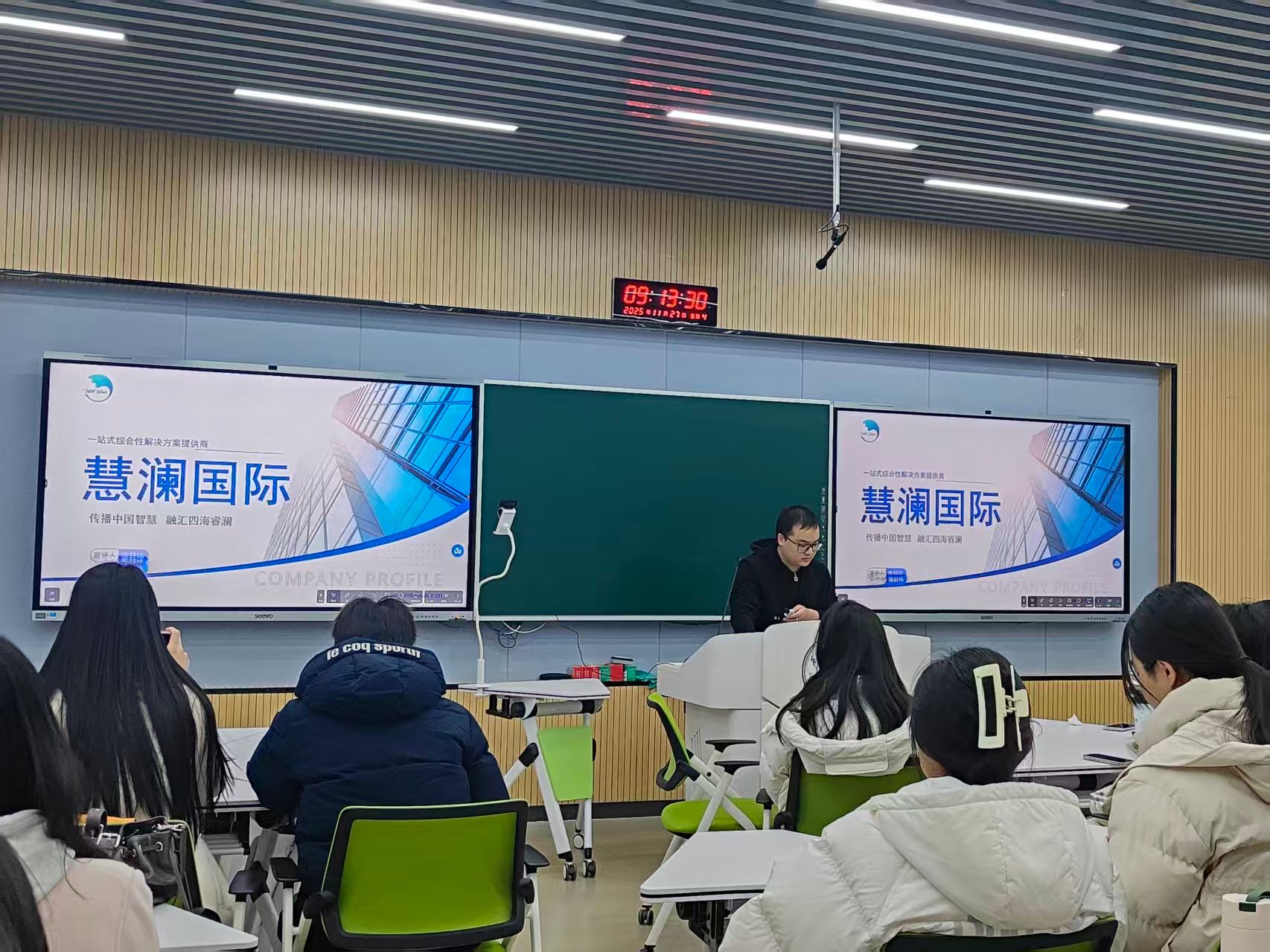 会议特邀我院实习合作单位——北京慧澜国际文化传播有限公司、西安雅信诚医药科技有限公司作进行实习宣讲。慧澜国际项目负责人张轩玮首先介绍了公司在全球化语言服务市场中的行业地位,强调了AI技术驱动和文化融合在多语言项目中的重要性。他通过实际案例,为同学们介绍了现场派驻、数据服务、出版外宣、职教出海等企业项目,阐释了企业对于翻译专业人才的需求。他特别提到,公司愿意为实习生提供丰富的实操岗位,以助力学生更好地了解行业动态,为翻译实践赋能。
