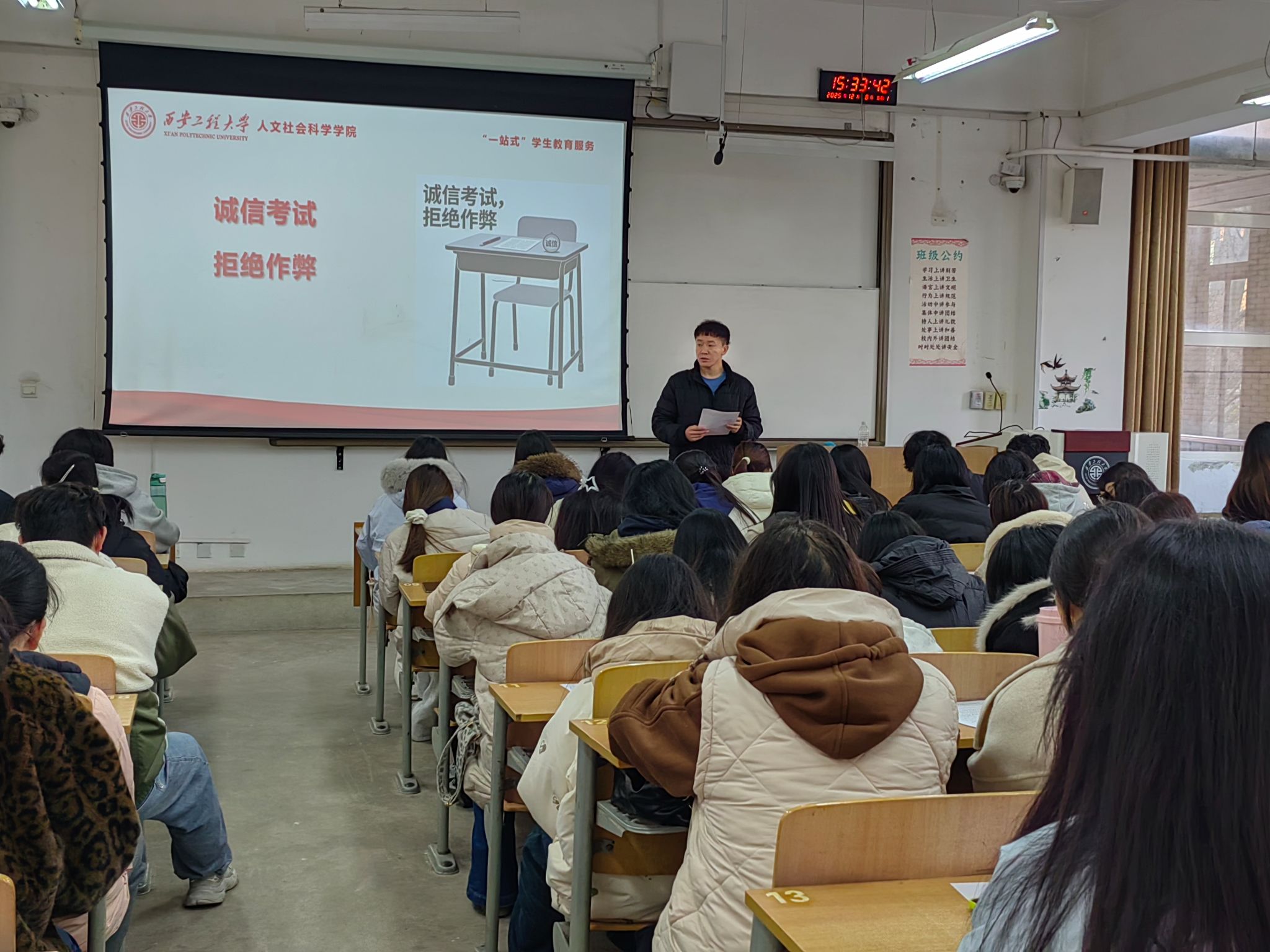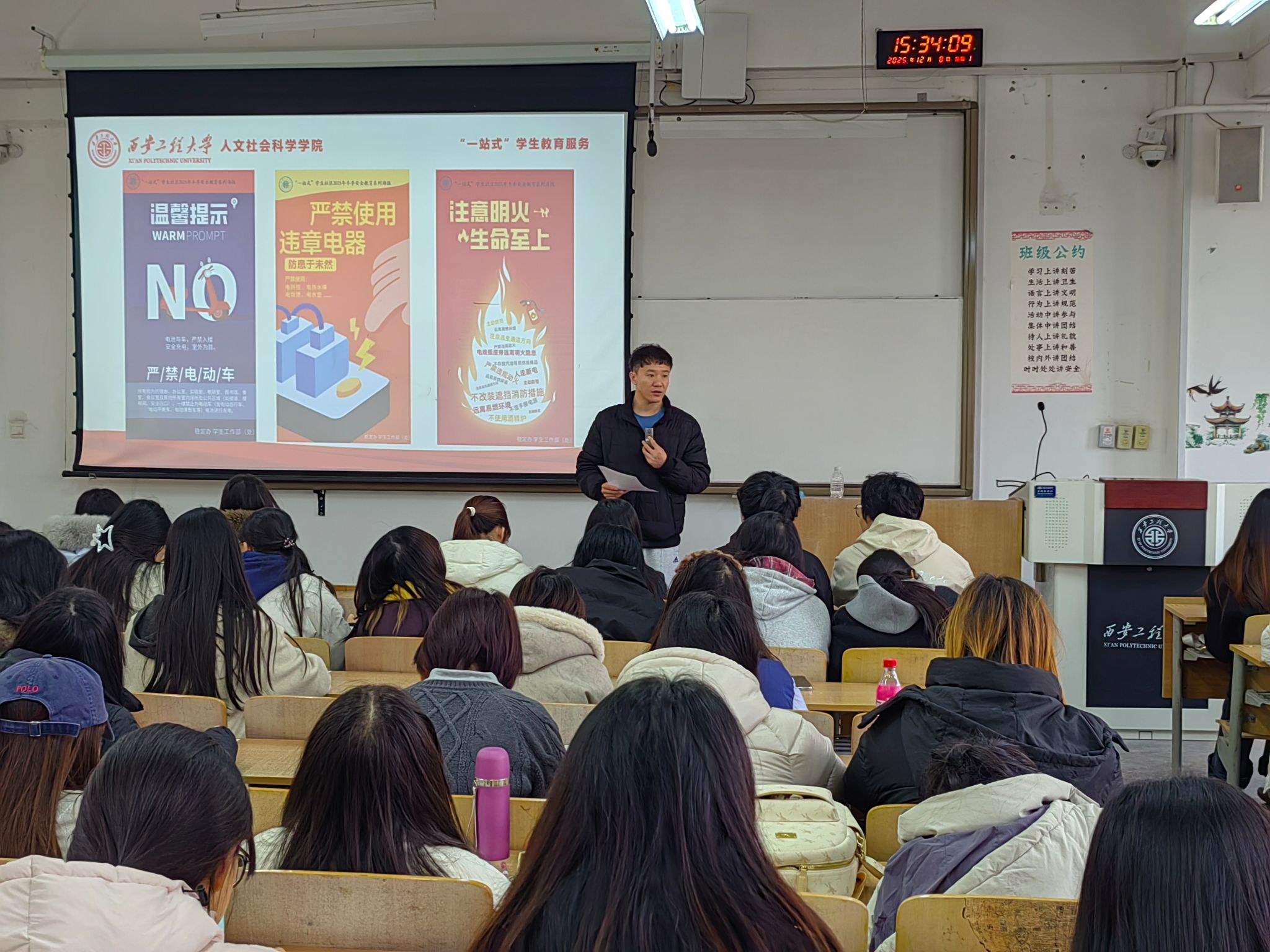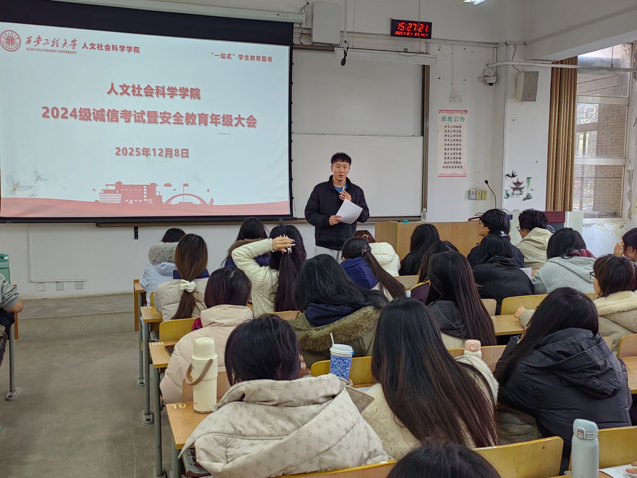 为强化学生诚信意识、筑牢校园安全防线,2025年12月8日下午,人文社会科学学院2024级辅导员刘杨扬在A栋317教室主持召开2024级诚信考试暨安全教育年级大会,2024级全体同学参会。