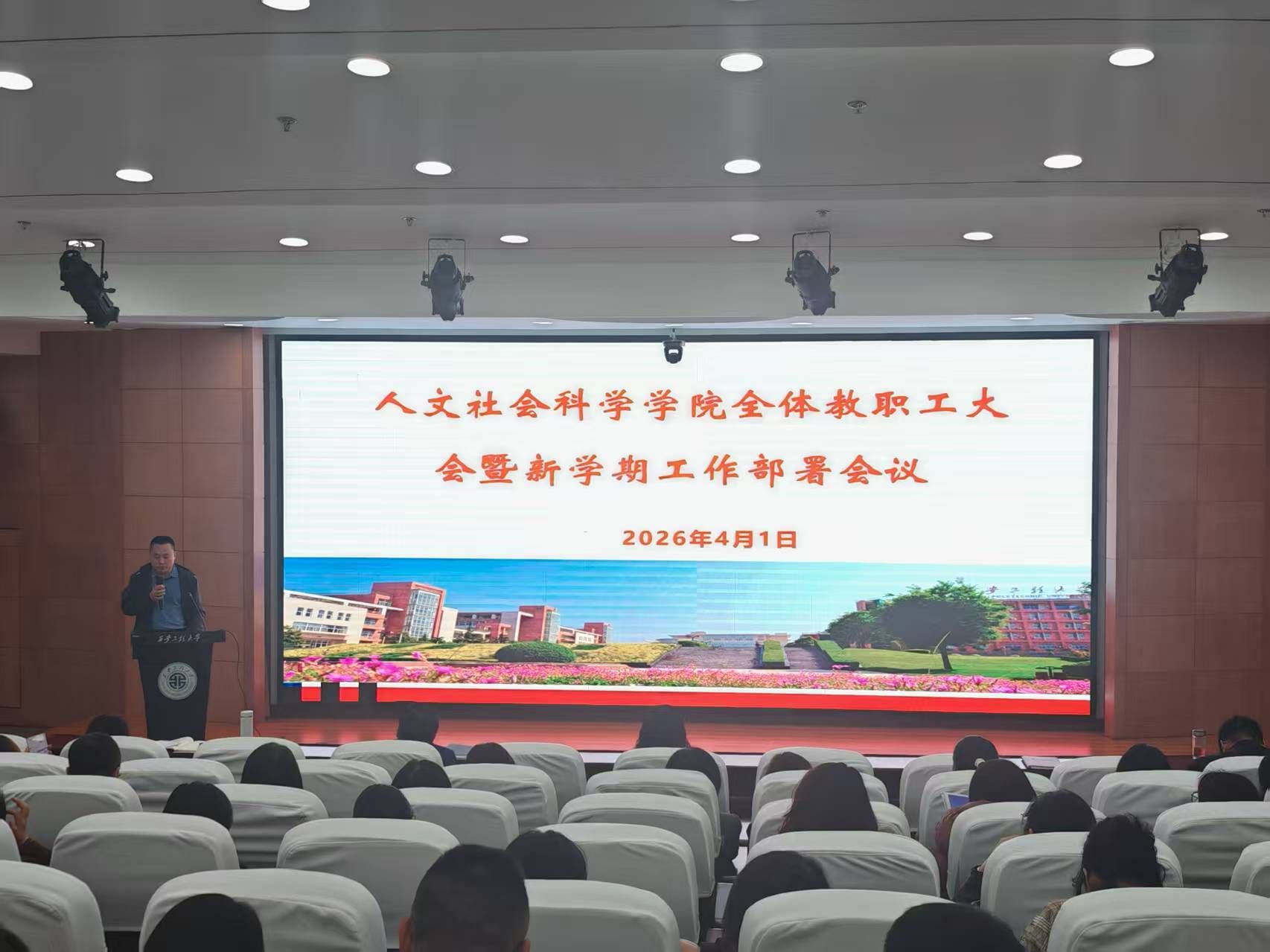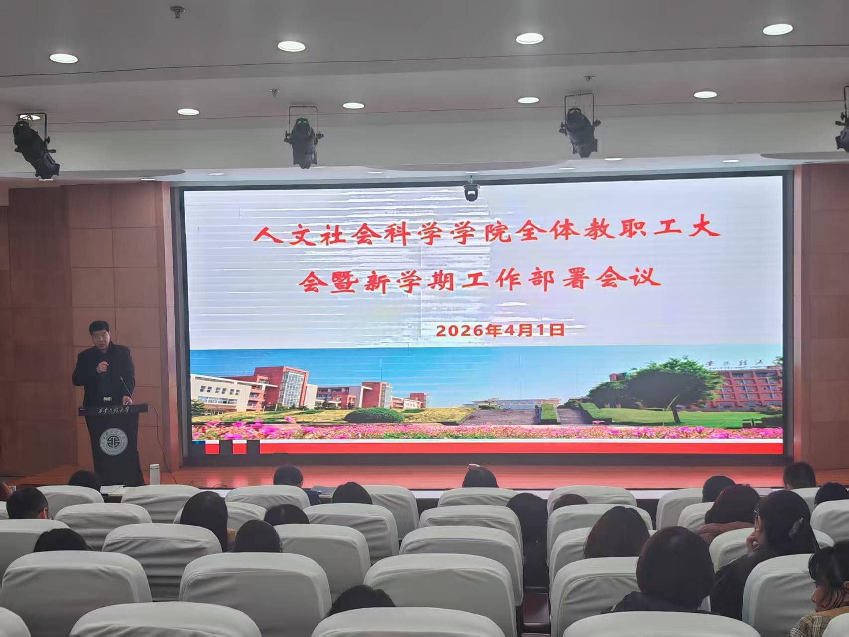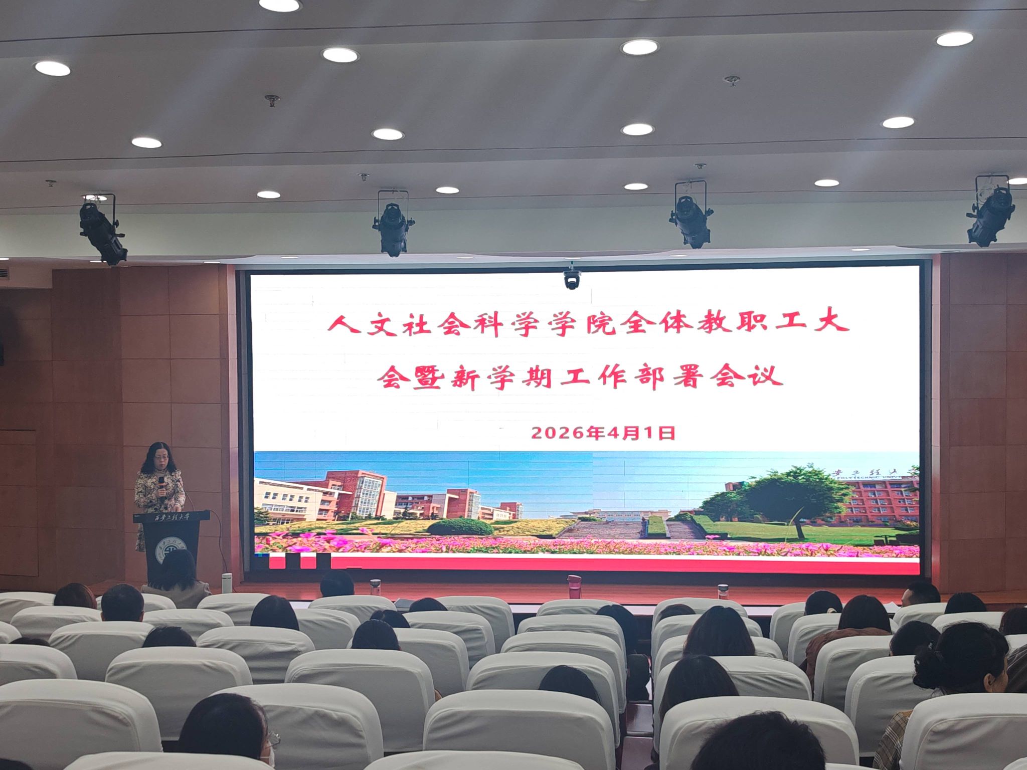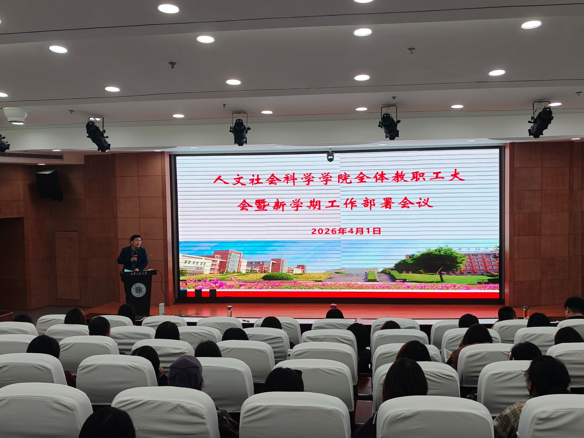 2026年4月1日下午,人文社会科学学院在临潼校区图书馆一楼报告厅召开新学期全体教职工大会暨2026年工作部署会议,学院班子成员及全体教职工参加会议,会议由学院院长陈莉霞主持。