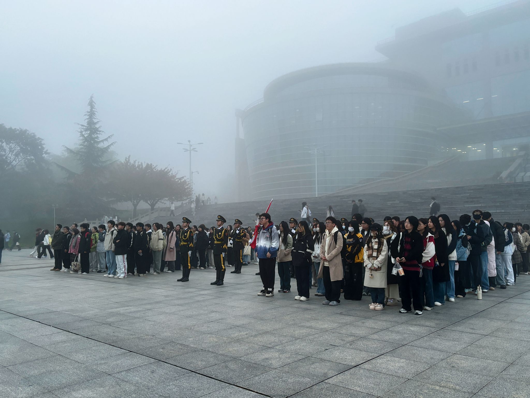 清晨薄雾中,参与升旗的人员准备就绪,国旗护卫队队员迈着整齐的步伐护送国旗入场。伴随着庄严的国歌,五星红旗穿透薄雾冉冉升起,全体学生怀着自豪与崇敬的心情,凝视着雾气中愈发鲜艳的国旗。随后,2025级英语2班张涵玉进行国旗下演讲,以“以青春之我,筑强国之基”为主题,结合青年责任与时代使命,号召在场学生将个人成长融入国家发展进程,以奋斗姿态践行时代责任。五星红旗迎风飘扬,现场响起热烈掌声,此次升旗仪式落下帷幕。