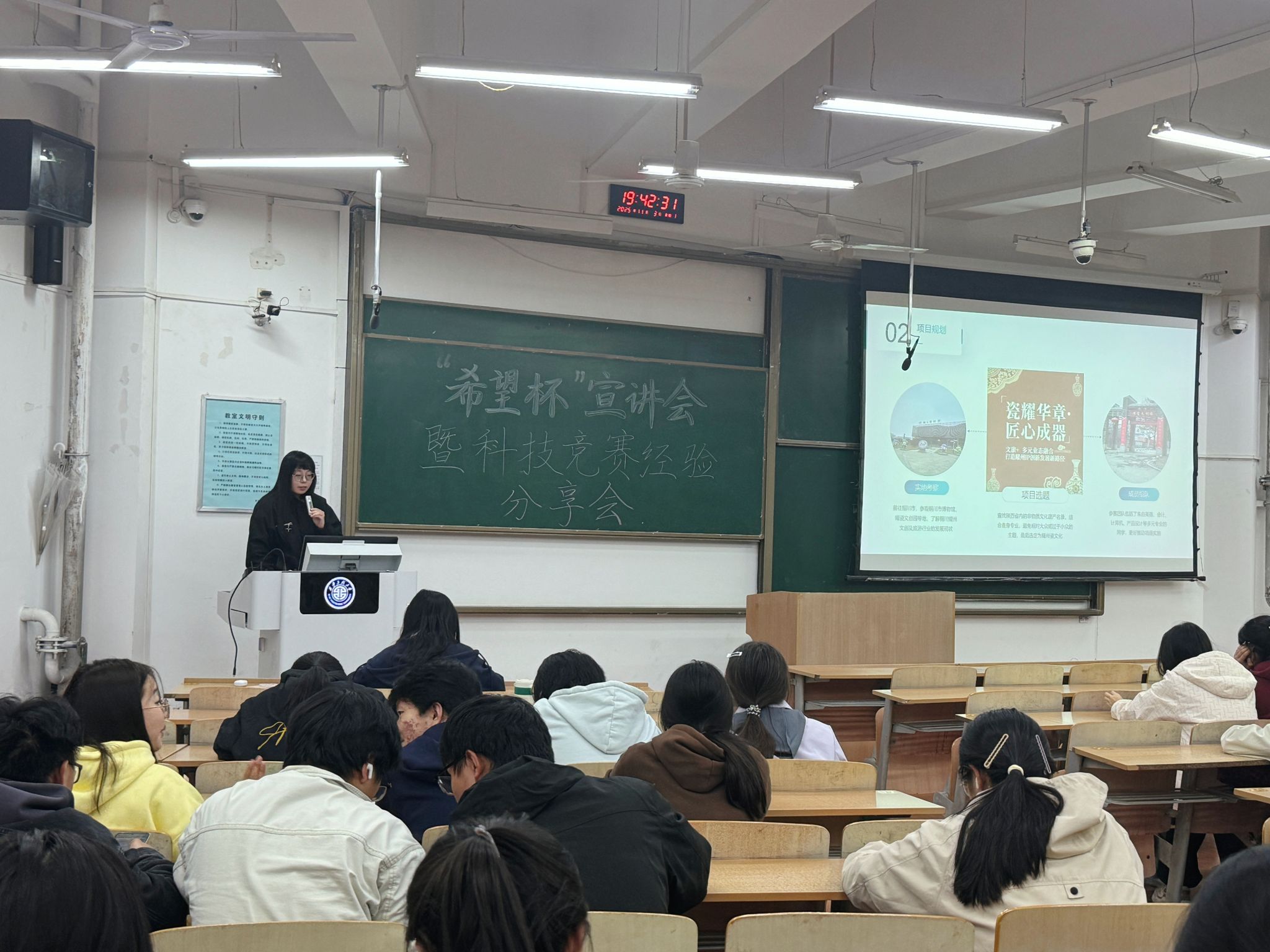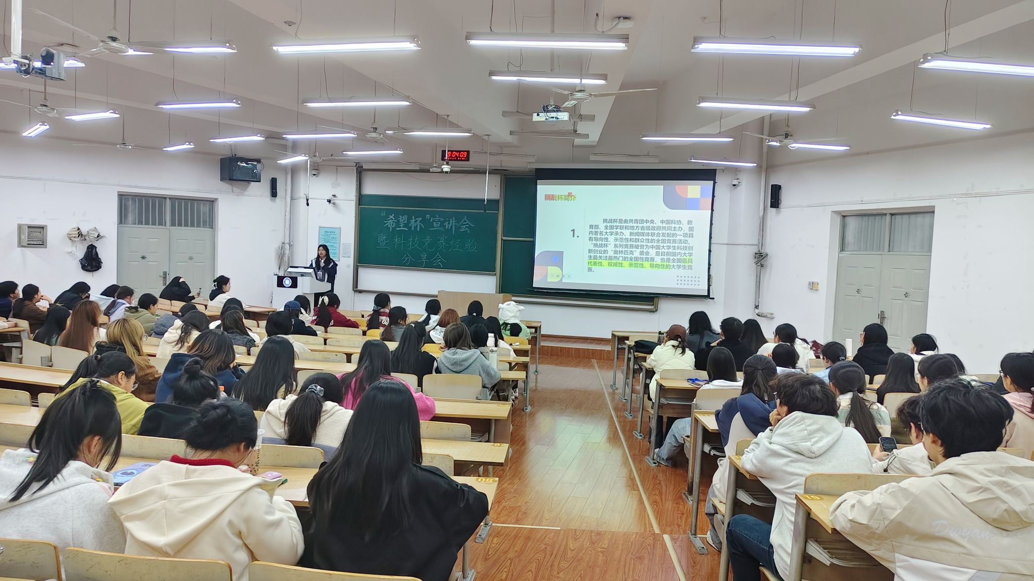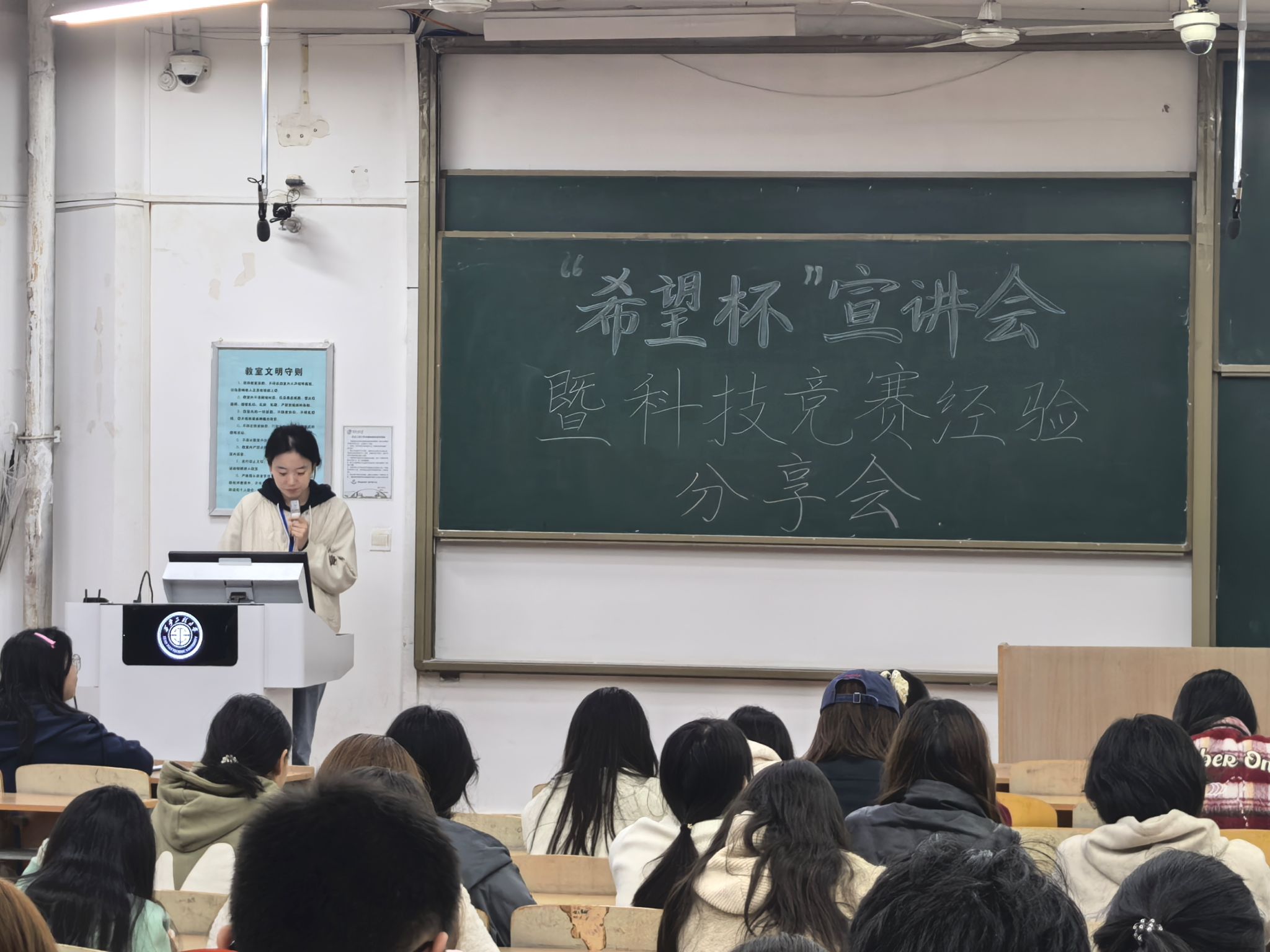 为深入学习贯彻习近平新时代中国特色社会主义思想,全面落实“科技是第一生产力、人才是第一资源、创新是第一动力”的重要论述,引导青年学子以科创实践锤炼创新思维、提升综合素养,人文社会科学学院于11月3日晚19:00在教学楼B-137召开“希望杯”宣讲会暨科技竞赛经验分享会。本次活动邀请学生代表瞿福榕、霍若木、王一凡担任主讲人,学院2025级全体本科生、2024级部分学生及研究生踊跃参会。