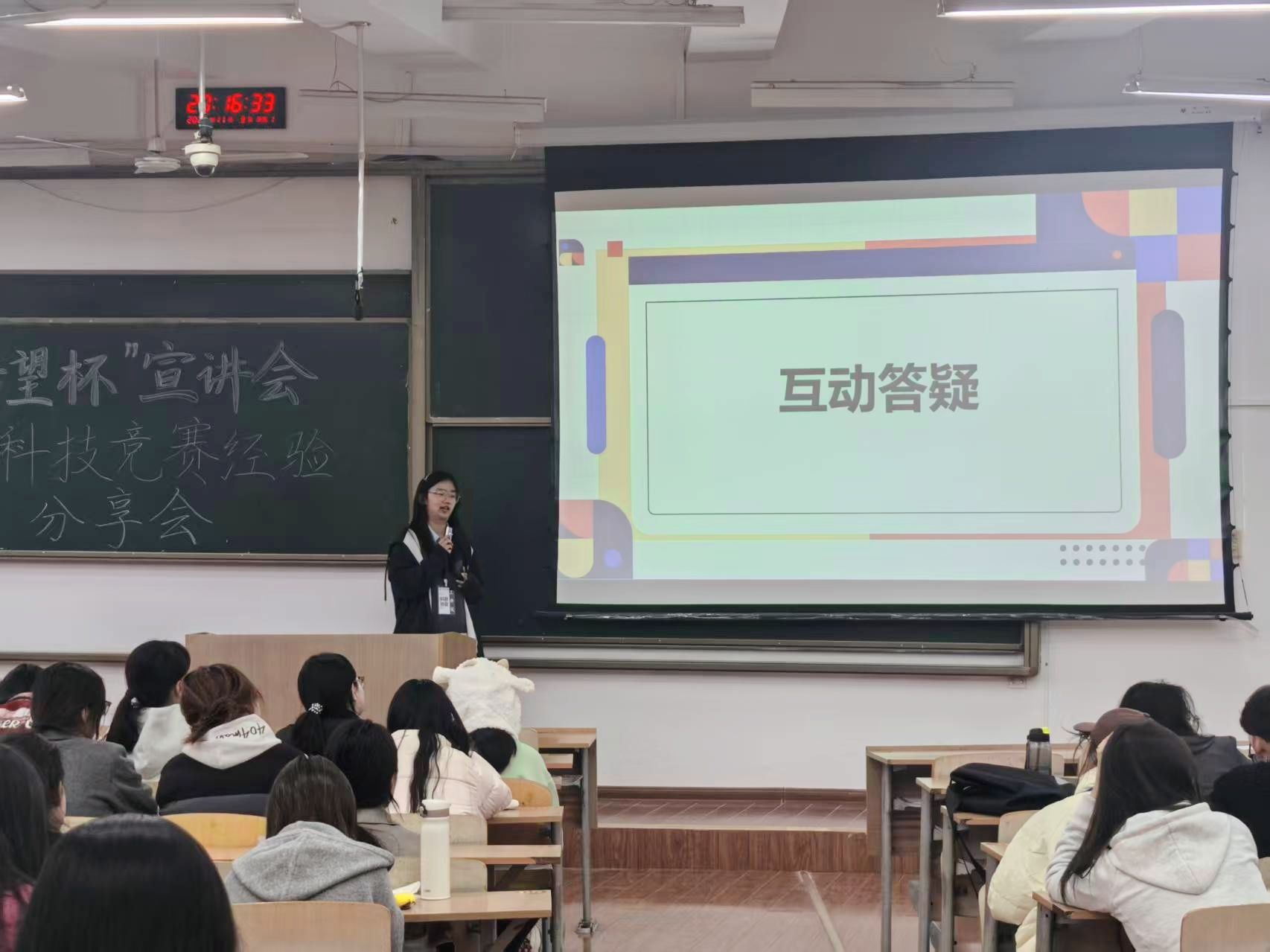 互动答疑环节氛围热烈,同学们围绕赛事规则细节、跨学科协作模式、备赛时间规划等重点问题积极提问。瞿福榕结合自身实践经验逐一细致回应,针对性破解备赛过程中的疑点难点,进一步凝聚了全院学子的参赛共识。现场问答节奏紧凑、干货满满,切实为同学们扫清了备赛障碍。