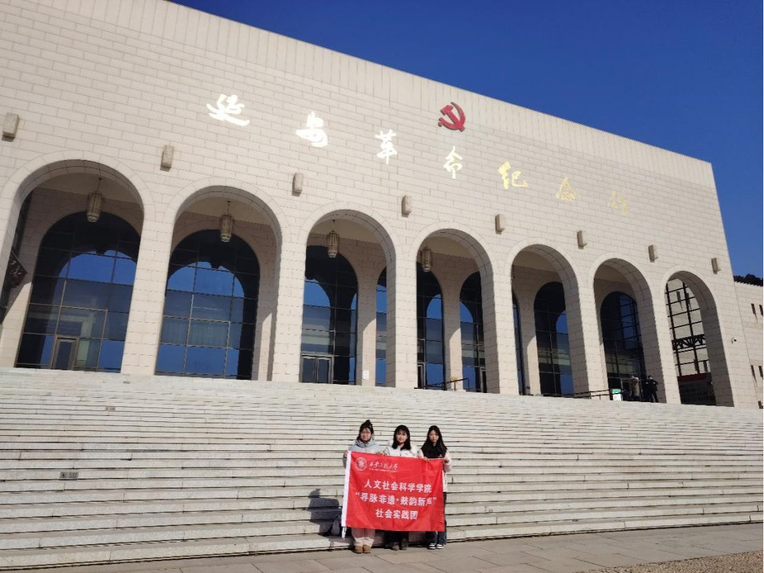 实践团首先来到延安革命纪念馆,这座庄严肃穆的建筑以其厚重的历史承载,成为实践团成员此行的精神起点。走进馆内,“中国革命大本营奠基西北”等详实的史料展板,带领实践团成员们回溯了1935年中央红军抵达陕北、建立革命大本营的峥嵘岁月。大家凝视着珍贵的文物与历史照片,深刻感悟到延安作为中国革命圣地的厚重底蕴,也明白了红色精神是滋养非遗传承的文化根脉。馆前的台阶上,实践团成员们手持鲜红的旗帜合影留念。这抹红色不仅是旗帜的颜色,更是实践团成员心中传承红色基因、守护非遗文化的信念之色。