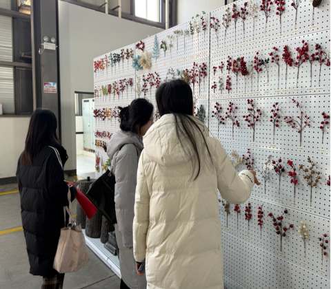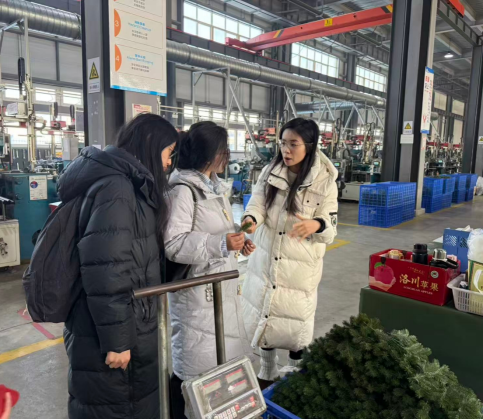 1月11日,实践团首站参观陕西咸阳汉元新材料科技有限公司。作为聚焦节日装饰全产业链的外向型企业,该公司主营的仿真圣诞树、人造植物等产品,正通过跨境电商平台走向“一带一路”沿线国家。在工作人员带领下,团队参观生产线厂房与展示区域厂房,直观感受标准化生产与企业市场洞察力。