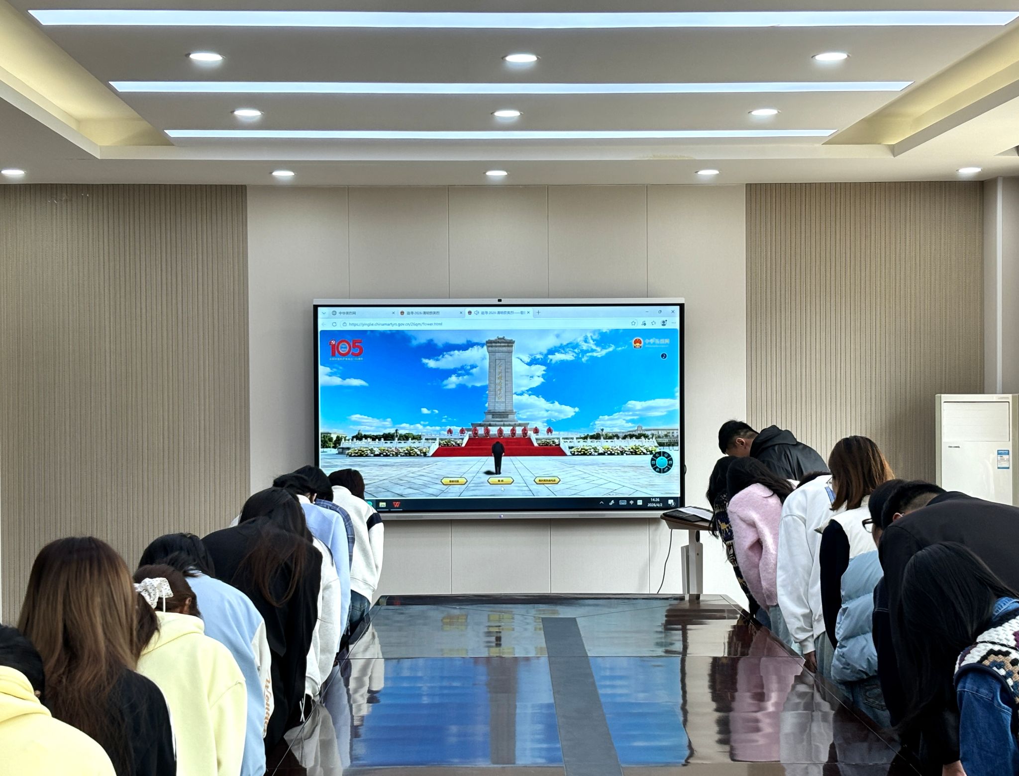 活动依托“中华英烈网”线上平台,全体师生在刘杨扬的引导下,进行“云端献花”“留言致敬”“观看红色纪录片”等环节。首先,在庄重严肃的背景音乐与致敬的视频画面衬托下,全体师生整齐肃立,缓缓向前躬身致敬,整个过程庄重而肃穆,让每一位参与者都能在沉浸式的仪式中感受先烈精神的温度。随后,大家认真观看烈士纪录片,深入了解革命先烈为民族独立、人民解放抛头颅、洒热血的英勇事迹。紧接着,师生们在平台上为英烈敬献鲜花,在留言区写下对先烈的缅怀与祝福,“致敬革命先烈,传承红色精神”“以吾辈之青春,护盛世之中华”等真挚话语,传递着青年学子的爱国情怀与责任担当。