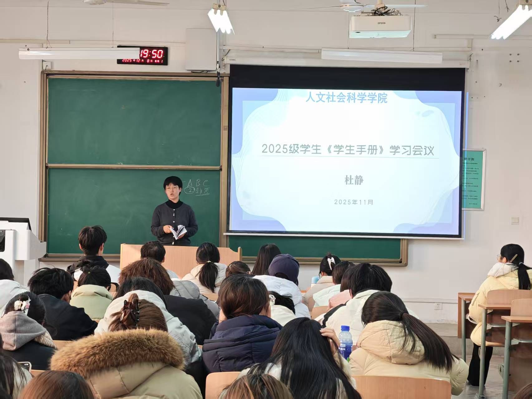 为扎实推进新生入学教育,强化校纪校规意识,引导学生树立自律观念、规范日常行为、提升自我管理能力,人文社会科学学院于2025年11月14日晚在教学楼A110教室组织开展了2025级新生《学生手册》专题学习活动。本次活动由学院学生工作办公室主任、2025级辅导员杜静主讲,全体2025级本科生参加。