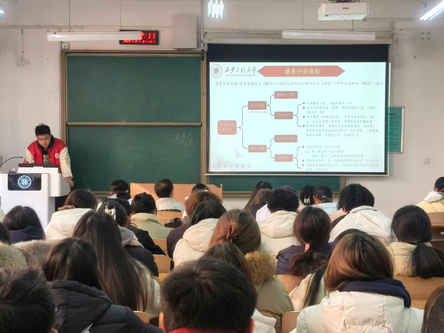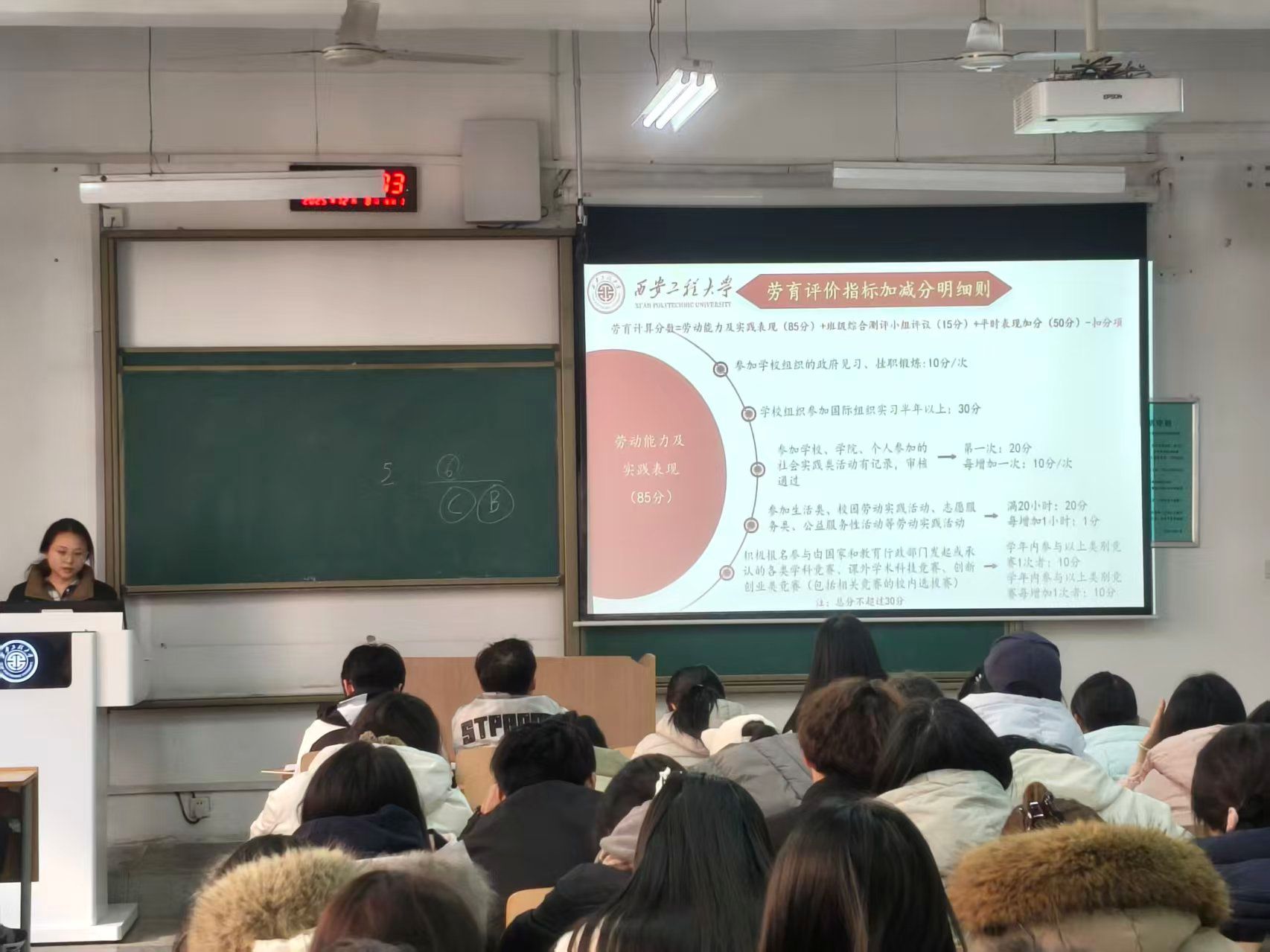 随后,学院学生工作办公室主任、资助专项辅导员杜静老师对宣讲内容进行了补充与总结。她强调了综合素质测评对学生全面发展的重要意义,提醒同学们重视日常积累与过程参与,并解答了部分学生的现场疑问。杜静老师表示,学院将持续做好政策答疑与指导工作,助力同学们合理规划学业与发展。